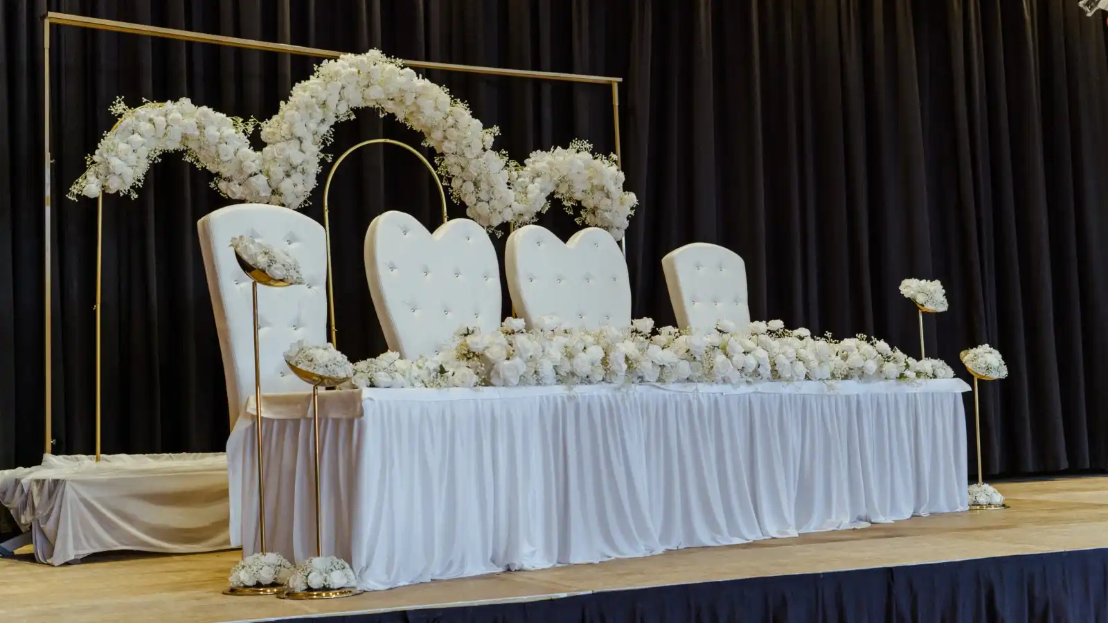 Euer großer Tag verdient eine Kulisse voller Eleganz und Liebe. Unser weißer Brauttisch mit goldenen Akzenten verleiht eurer Hochzeit eine zeitlose Schönheit. Die Kombination aus strahlendem Weiß und edlem Gold schafft eine festliche Atmosphäre, während frische Blumen das Design mit einer zarten, romantischen Note abrunden. Ergänzt wird das Arrangement durch unsere exklusiven Herzstühle und den goldenen Hochzeitsbogen, geschmückt mit weißen Blüten – eine Szenerie wie aus einem Märchen. Lasst euch verzaubern und macht eure Hochzeit unvergesslich!