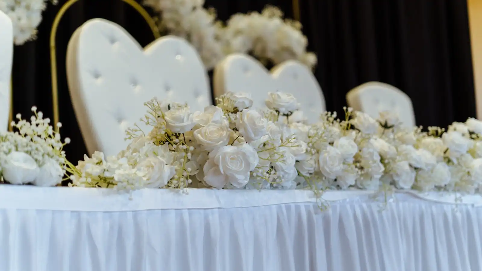 Unser weißer Brauttisch mit zwei exklusiven Ledersesseln in Herzform verleiht Ihrem großen Tag eine besondere Note. Das florale Arrangement aus weißen Rosen, veredelt mit zarten rosa Akzenten, unterstreicht die Harmonie dieses einzigartigen Hochzeitsensembles. Ob als stilvoller Mittelpunkt der Feier oder als Kulisse für unvergessliche Fotos – dieser Brauttisch schafft Momente voller Schönheit und Emotion.