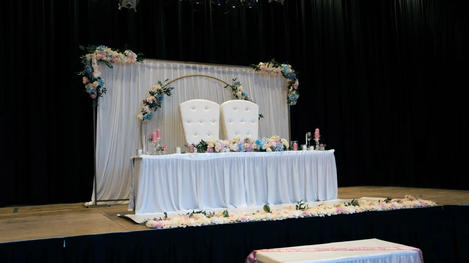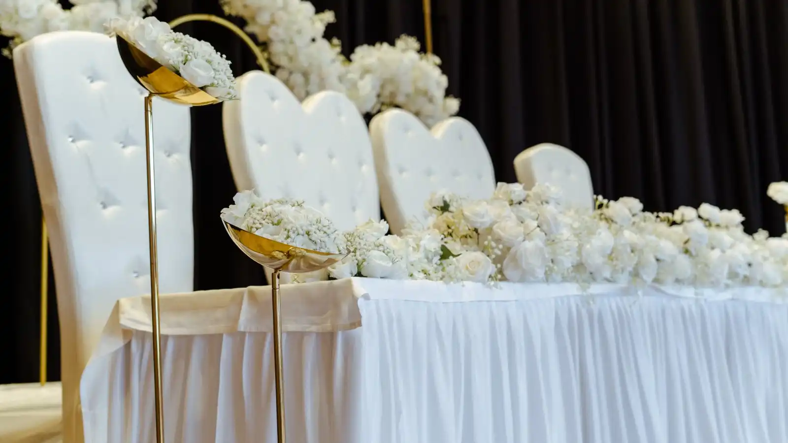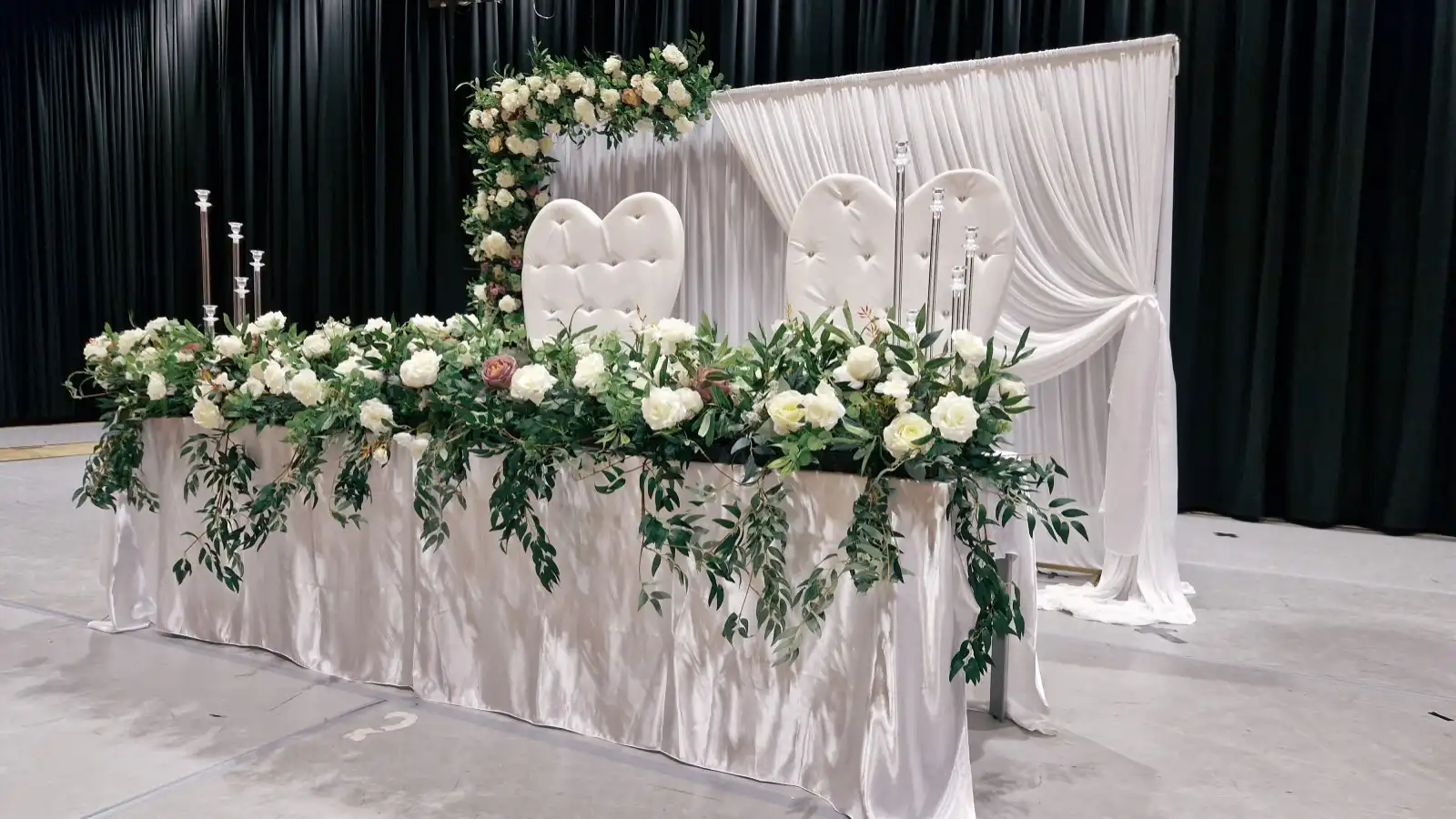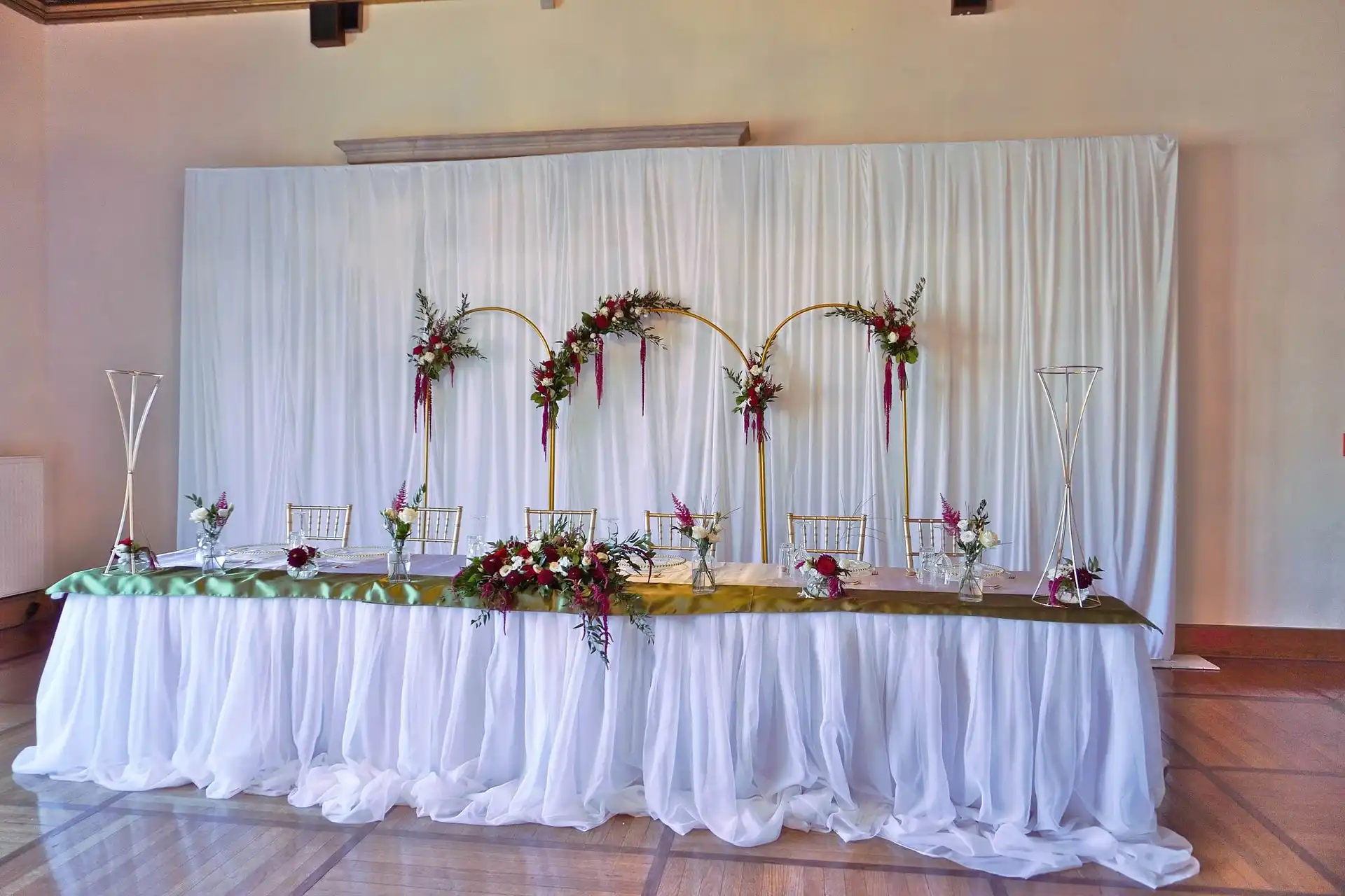 Der Brautisch strahlt pure Eleganz aus und ist ein wahres Highlight jeder Hochzeit. Im Hintergrund erstreckt sich ein beeindruckender goldener Bogen, geschmückt mit einer Fülle bunter Blumen, die für einen lebendigen und romantischen Akzent sorgen. Die Farben der Blumen schaffen eine perfekte Balance zwischen Frische und Festlichkeit. Die weißen Brautstühle aus edlem Leder bieten nicht nur Stil, sondern auch Komfort für das Brautpaar. Der Tisch selbst ist so platziert, dass das Brautpaar einen ungehinderten Blick auf all ihre Gäste hat – eine Verbindung, die Nähe und Gemeinschaft symbolisiert. Dieses harmonische Arrangement sorgt dafür, dass der Brautisch sowohl ein optischer als auch emotionaler Mittelpunkt der Feier wird – der perfekte Platz, um Liebe und Freude mit allen Anwesenden zu teilen.
