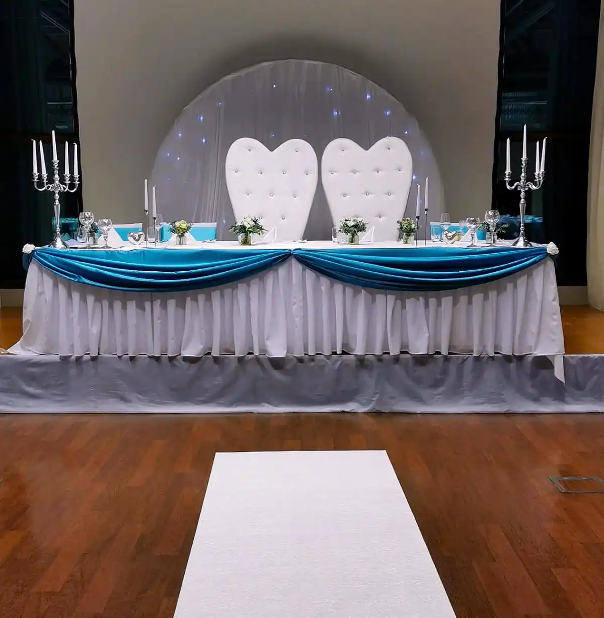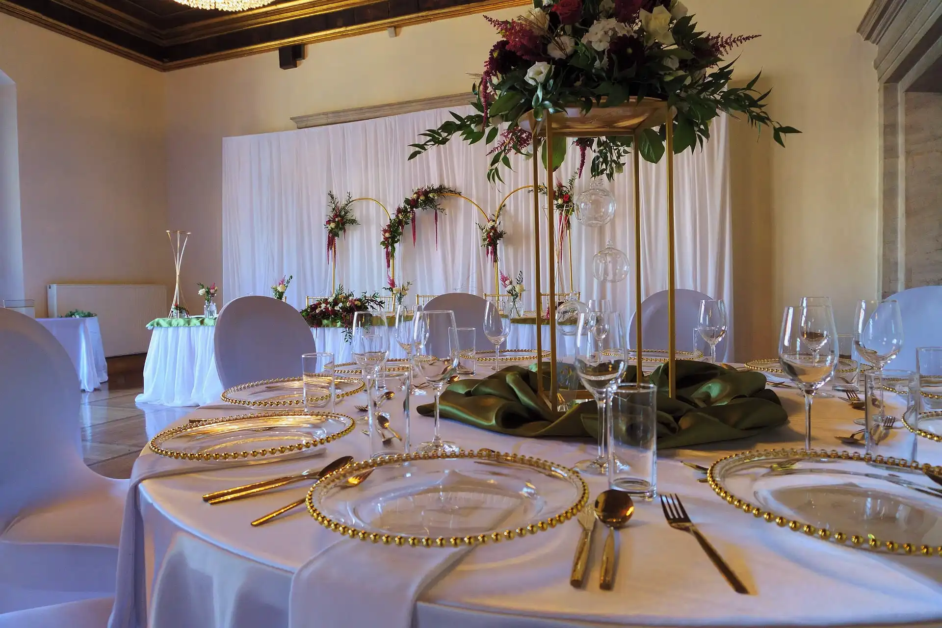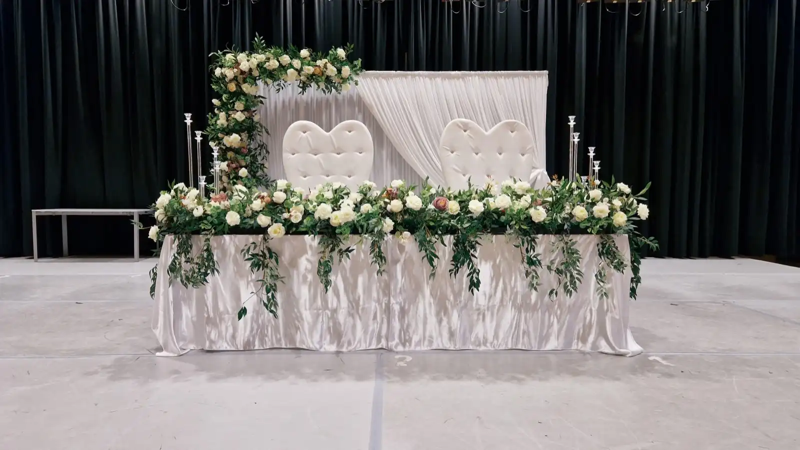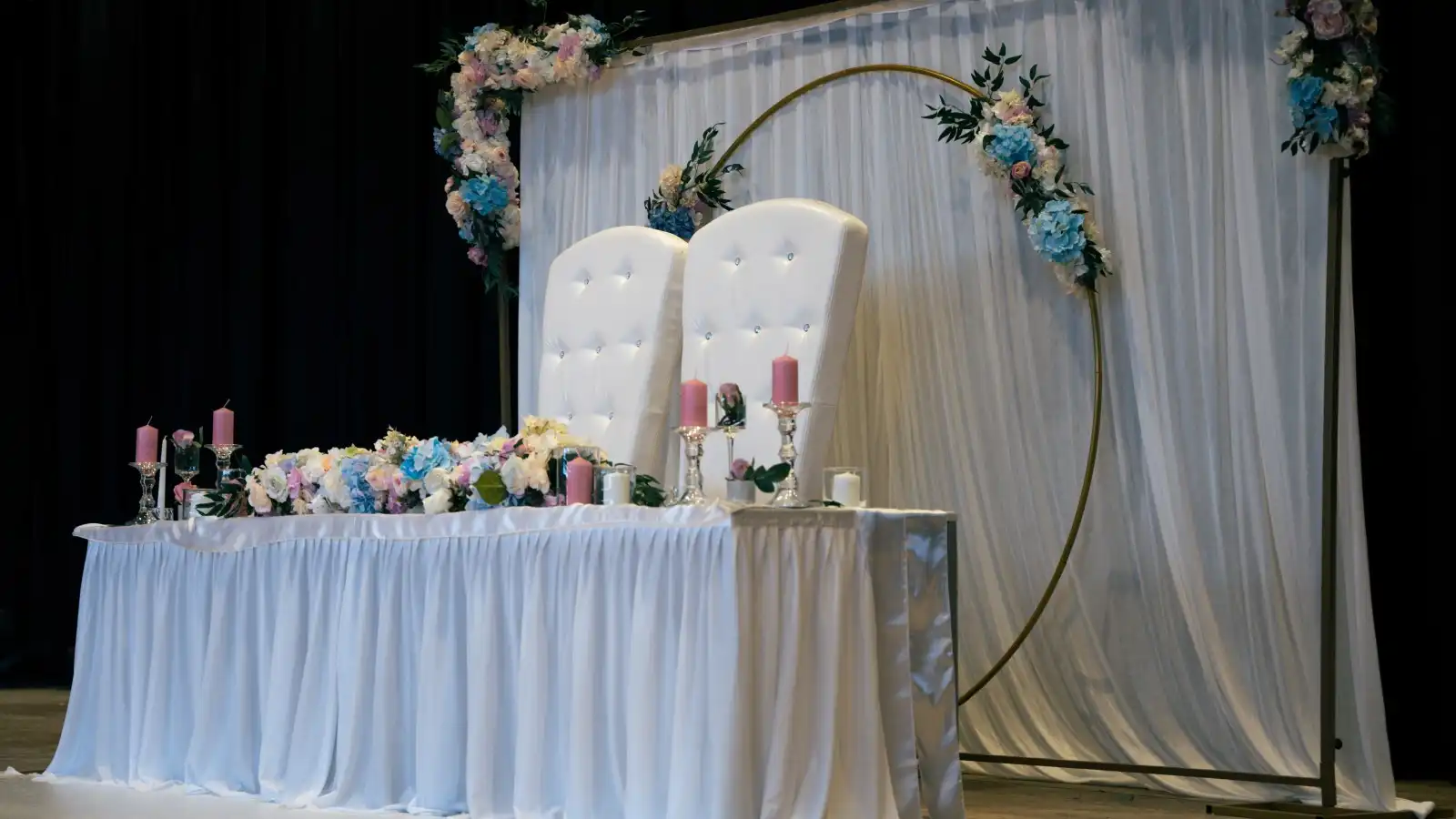 Der Brautisch strahlt pure Eleganz aus und ist ein wahres Highlight jeder Hochzeit. Im Hintergrund erstreckt sich ein beeindruckender goldener Bogen, geschmückt mit einer Fülle bunter Blumen, die für einen lebendigen und romantischen Akzent sorgen. Die Farben der Blumen schaffen eine perfekte Balance zwischen Frische und Festlichkeit. Die weißen Brautstühle aus edlem Leder bieten nicht nur Stil, sondern auch Komfort für das Brautpaar. Der Tisch selbst ist so platziert, dass das Brautpaar einen ungehinderten Blick auf all ihre Gäste hat – eine Verbindung, die Nähe und Gemeinschaft symbolisiert. Dieses harmonische Arrangement sorgt dafür, dass der Brautisch sowohl ein optischer als auch emotionaler Mittelpunkt der Feier wird – der perfekte Platz, um Liebe und Freude mit allen Anwesenden zu teilen.