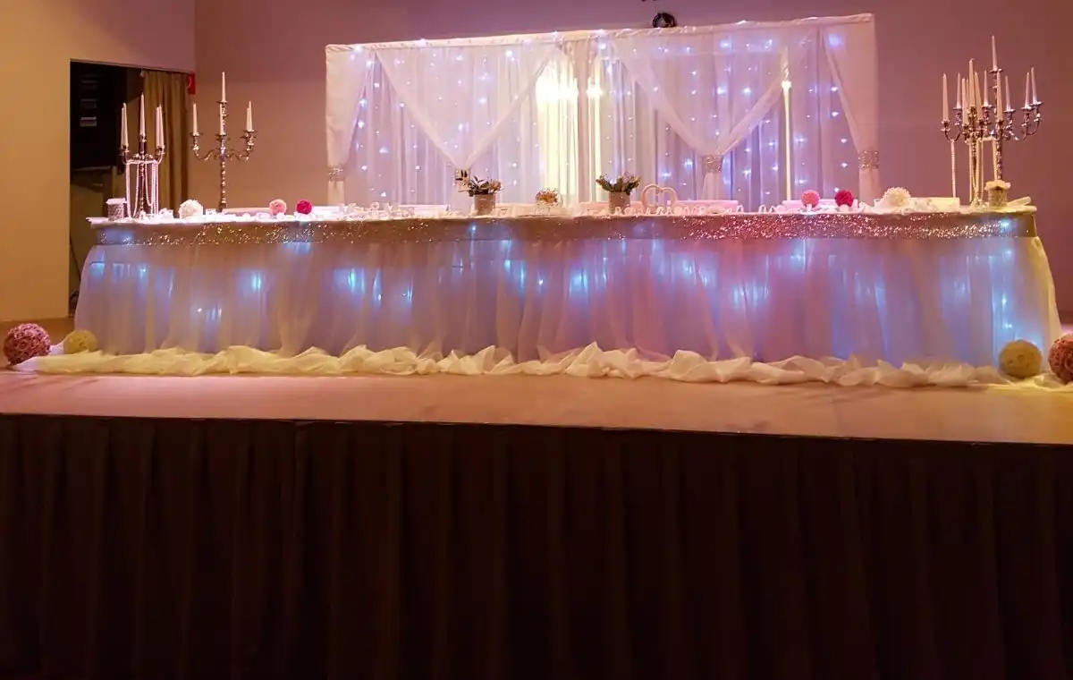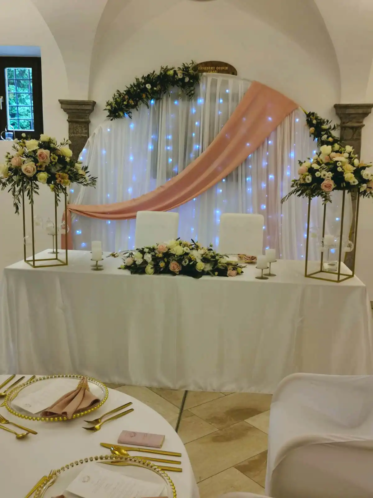 Durch die LED-Beleuchtung erstrahlte der Brauttisch in einem märchenhaften Licht, das eine ganz besondere Atmosphäre schuf. Das Licht unterstrich das freudige Strahlen des Brautpaares und machte diesen Moment noch magischer. Der Tisch wurde so zum Hauptblickfang der Feier, der nicht nur die Augen der Gäste verzauberte, sondern auch eine warme, festliche Stimmung verbreitete. Ein strahlender Ort, an dem die Liebe des Brautpaares sichtbar und spürbar wurde.