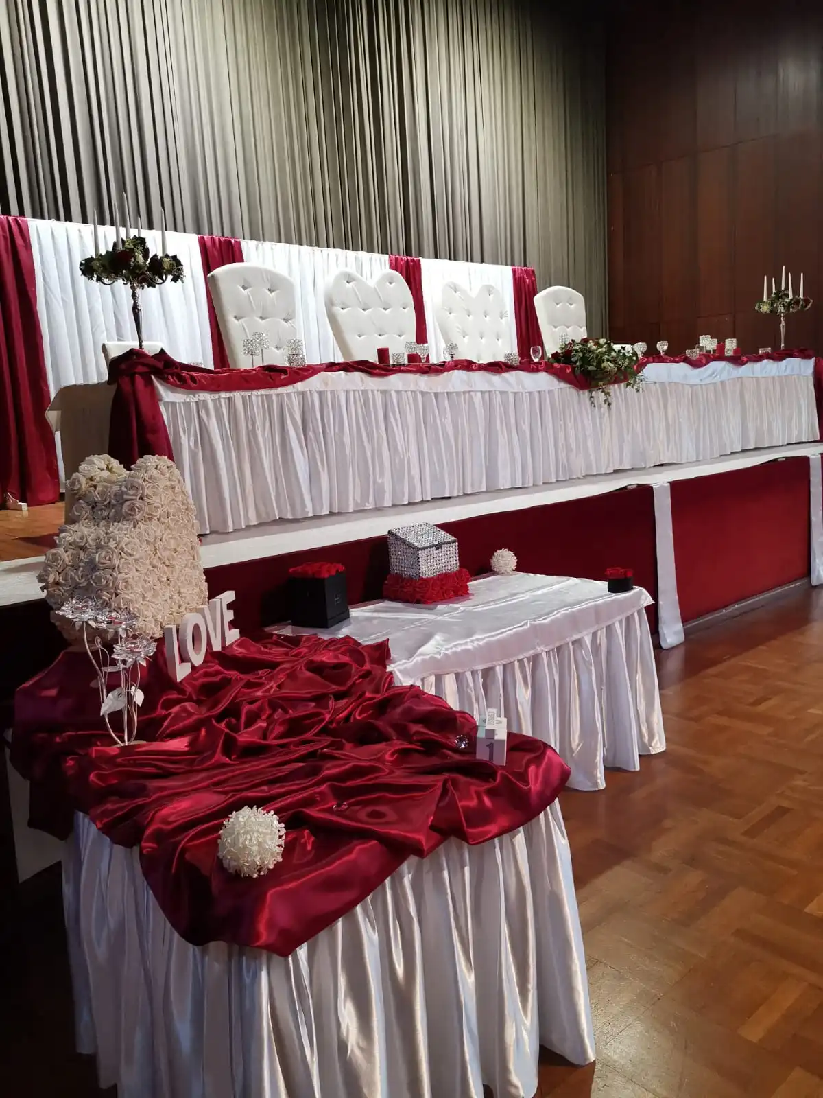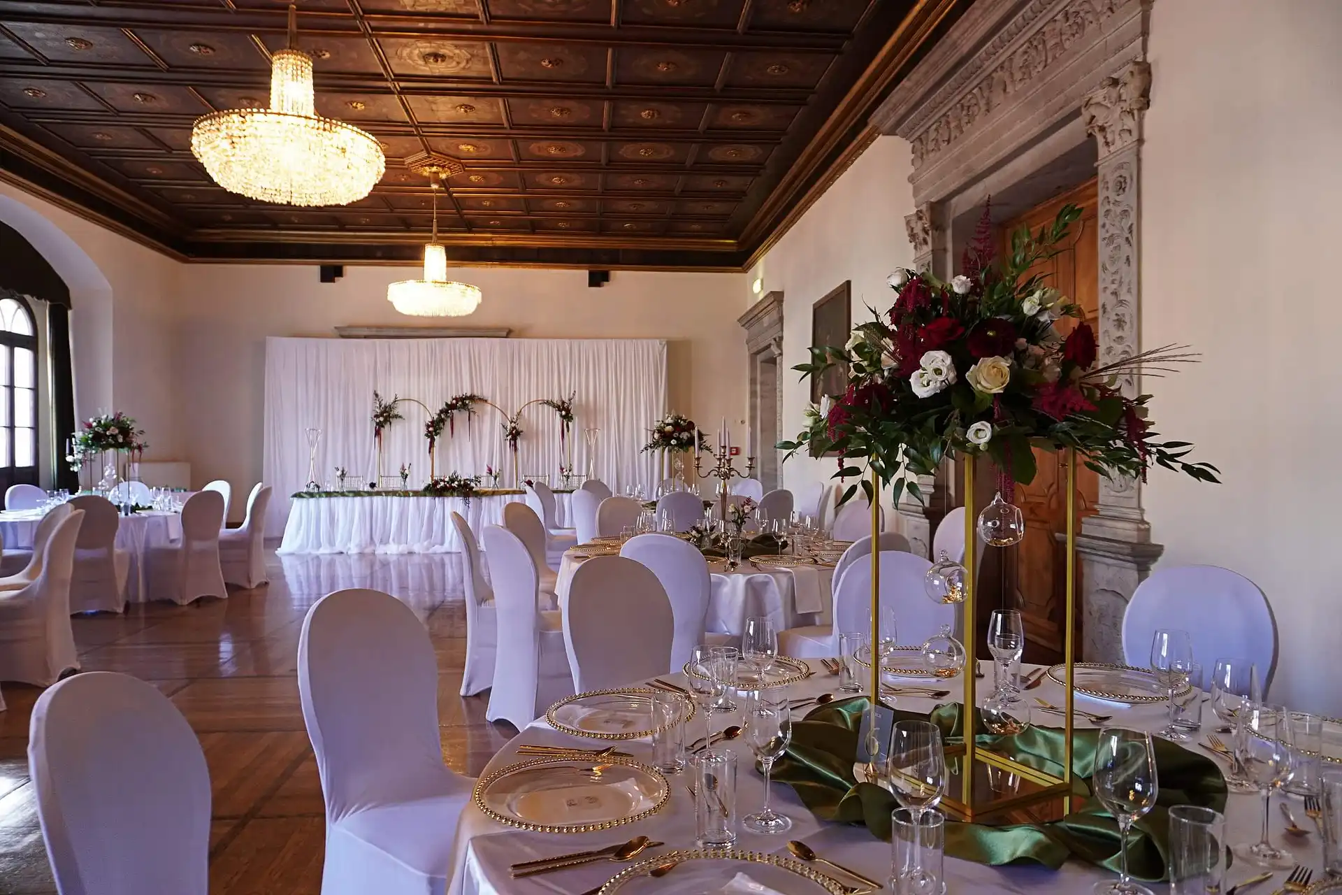 Für dieses glückliche Paar stand die Farbe der Liebe im Mittelpunkt ihrer Hochzeit. Der Brauttisch in Bordeaux strahlt pure Eleganz und Romantik aus, während der beeindruckende 6 Meter lange rote Hintergrund dem Ambiente eine kraftvolle, charaktervolle Tiefe verleiht. Jedes Detail dieses Arrangements unterstreicht die Leidenschaft und Wärme, die diesen besonderen Tag so unvergesslich machen. Ein Brauttisch, der nicht nur durch seine edle Farbgebung besticht, sondern auch durch seinen ausdrucksstarken Präsenz.