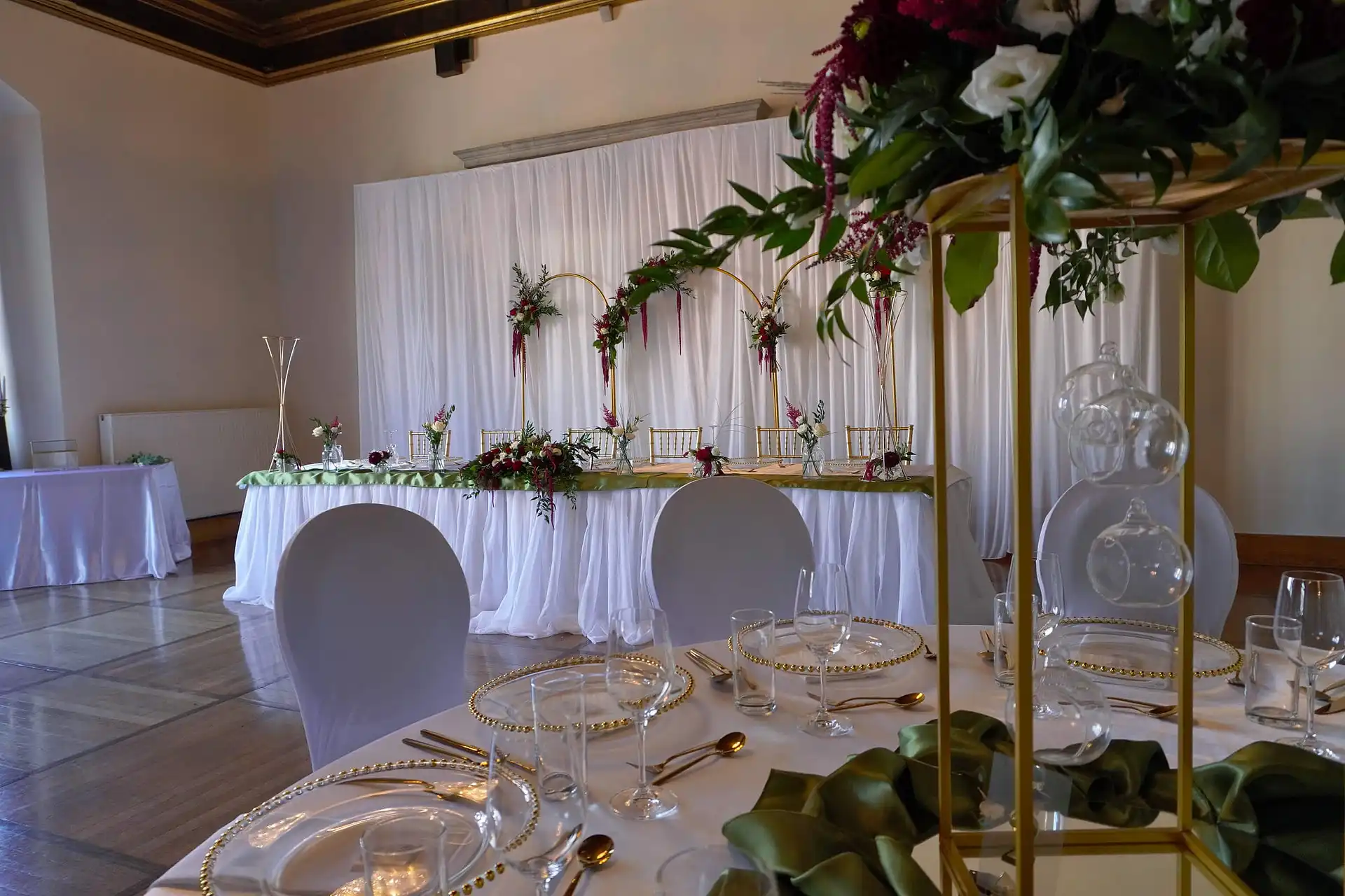 Der Brauttisch Mery besticht durch seine stilvolle Schlichtheit und edlen goldenen Elemente. Die harmonische Farbkombination aus Gold, Grün und Rot verleiht dem Tisch eine luxuriöse, aber zurückhaltende Eleganz. Dezente Blumenarrangements setzen gezielte Akzente und unterstreichen das edle Design, ohne es zu überladen.