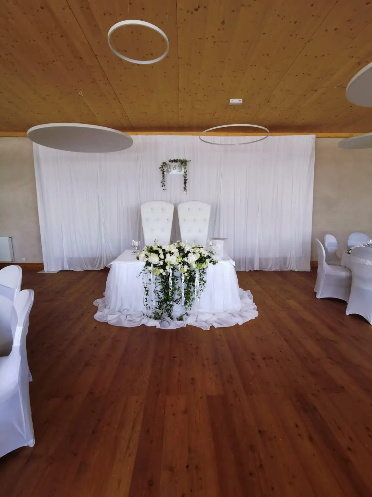 Die Dekoration des Brauttischs ist ein zentrales Element jeder Hochzeit und sollte harmonisch in das Gesamtbild Ihres Festes eingebunden sein. Wir gestalten Ihre Tischdekoration individuell nach Ihren Wünschen und stimmen sie perfekt auf das farbliche Konzept Ihrer Hochzeit ab. Ob elegante Blumenarrangements, romantische Kerzen, stilvolle Girlanden oder edle Stoffe – jedes Detail wird sorgfältig ausgewählt, um eine stimmige und festliche Atmosphäre zu schaffen. Dabei achten wir darauf, dass die Dekoration edel und harmonisch wirkt, ohne überladen zu sein. Lassen Sie uns gemeinsam einen Brauttisch kreieren, der Ihre Hochzeit unvergesslich macht!
